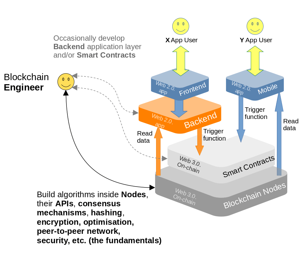 - Blockchain Developer, which build apps on (and around) blockchain using mainly SmartContracts (usability)
